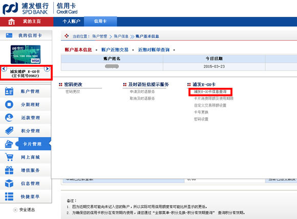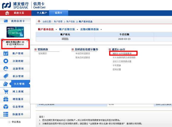 | 1.登入浦发信用卡网银,切换至美国运通E-GO卡,点击“卡片管理”-“浦发E-GO卡”-“浦发E-GO卡信息查询” |