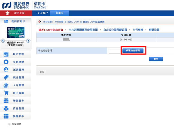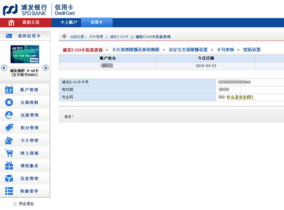 | 1.登入浦发信用卡网银,切换至VISA/万事达/银联E-GO卡,点击“卡片管理”-“浦发E-GO卡”-“浦发E-GO卡信息查询” |