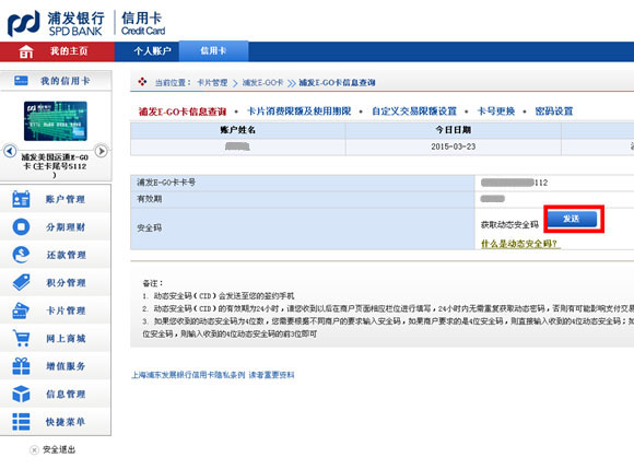 | 2.页面直接显示您美国运通E-GO卡的卡号和有效期,美国运通E-GO卡采用动态安全码,您需要点击页面上的“发送”按钮,动态安全码将以手机短信的形式发送至您的签约手机,动态安全码24小时有效。您将美国运通E-GO卡的卡号、有效期和动态安全码输入在线商户结算页面的相应栏位后,即可完成交易。 |